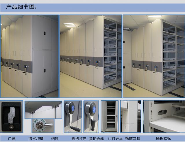 產(chǎn)品名稱:防水型密集柜/架產(chǎn)品規(guī)格:長(zhǎng)900mm*深500mm*高2800mm產(chǎn)品結(jié)構(gòu): 立柱為接插型,整體高度為2800mm,防水溝槽高度100mm,7層隔板,雙面存放,層高330-340mm。板材厚度根據(jù)客戶要求,搖把自選。產(chǎn)品顏色:套色,基色為亞光灰本產(chǎn)品可以根據(jù)用戶要求定制。